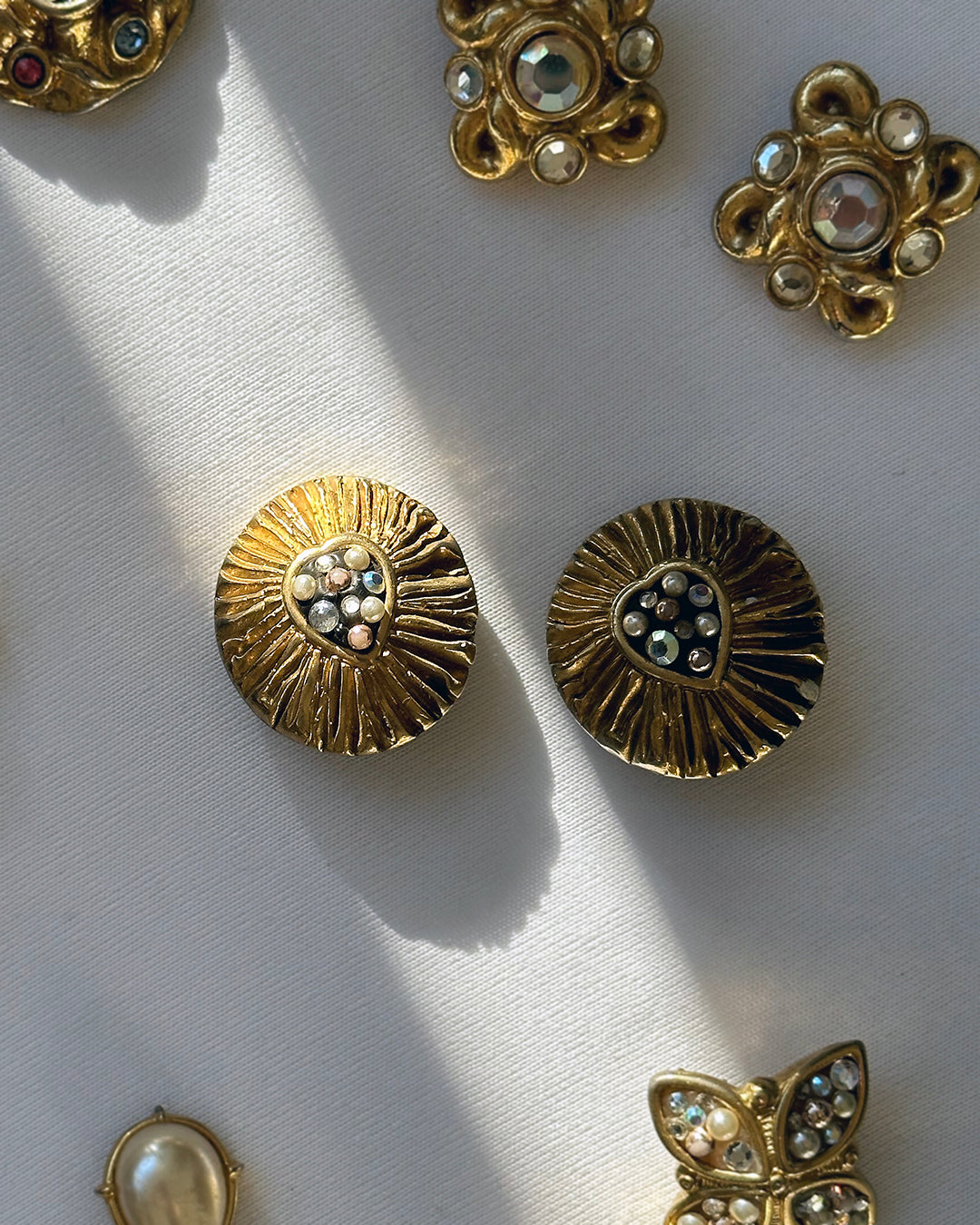 These earrings add a touch of whimsy to anything. Made by famed Parisian jeweler Jacky de G in the 1980s, they feature a heart-shaped sun motif— the brushed gold border looks like sun rays. The heart-shaped center is set with pearls and stones; the black resin they are set in really allows the jewels to pop and sparkle to their full potential. Statement earrings defined the style of the 1980s; French couture houses used costume jewelry to tell their story. The best jewelers worked for the big houses like J ean-Paul Gaultier, Guy Laroche, Givenchy, Dior, Chanel, Christian Lacroix and among them was the jeweler known as Jacky de G. She produced jewelry for her own label (which is signed as such) as well as for these houses, so her designs and sensibility have an immeasurable influence. Her jewelry was only produced for a short period, which makes it highly sought-after and collectable. These earrings are signed Jacky de G / Made in France. Measures about 4 cm long, and finished with a clip-on back. The other vintage earrings pictured are also available in my shop.