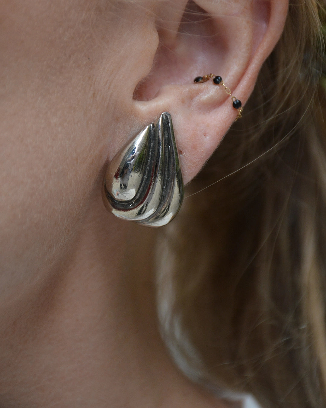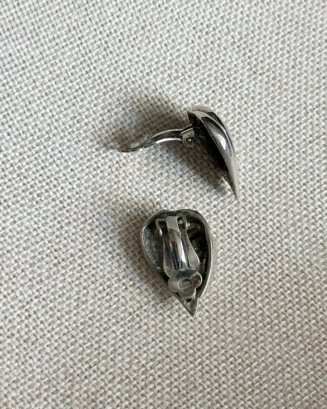 These vintage silver sculptural wave studs add a touch of minimal cool to any look. This is a vintage style that designers today, such as Balenciaga, are constantly drawing upon. They look like the work of a midcentury Mexican silver artist, although they are no signed, it is possible that that is indeed their origin. They are finisshed with a clip-on lever back, and are extremely lightweight due to their intentional construction; Vintage clip-on earrings are so much more comfortable and secure to wear compared to their modern counterparts, largely due to the top quality and strategic design that went into their hand-made construction. Additionally, these earrings are hollow inside, decreasing their weight on the ear, while maintaining all the shape. Measures about 30 mm long x 18 mm at widest point.