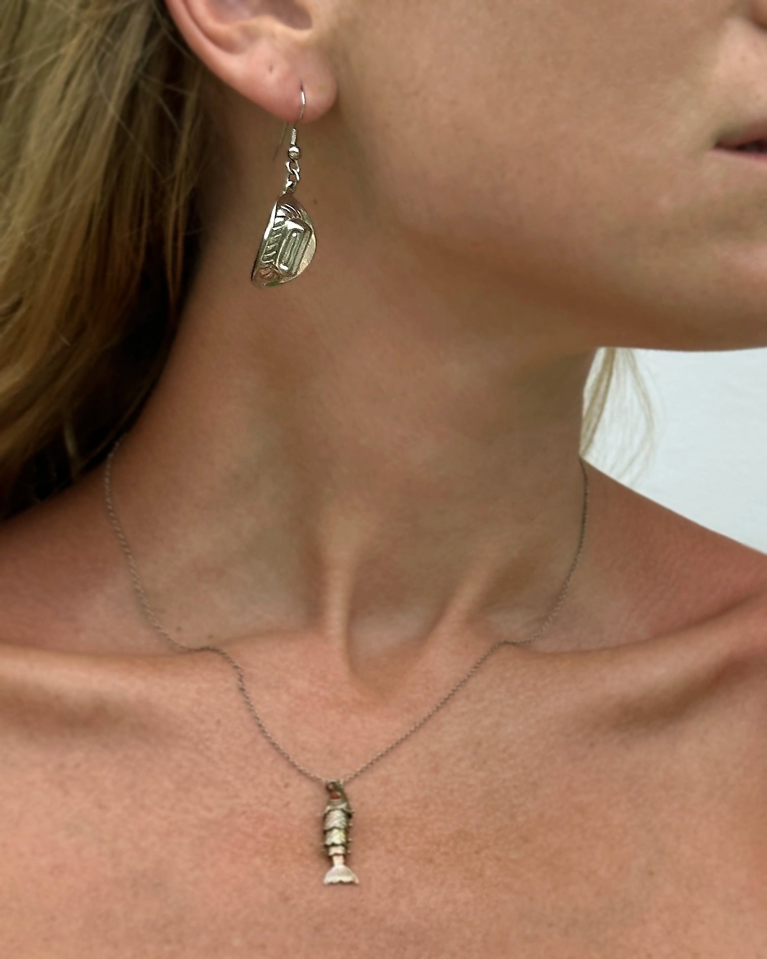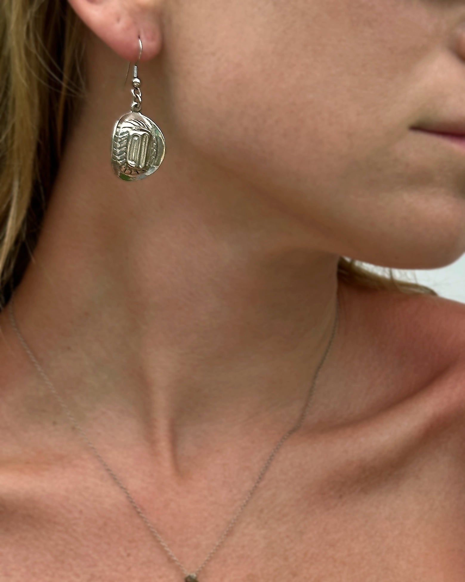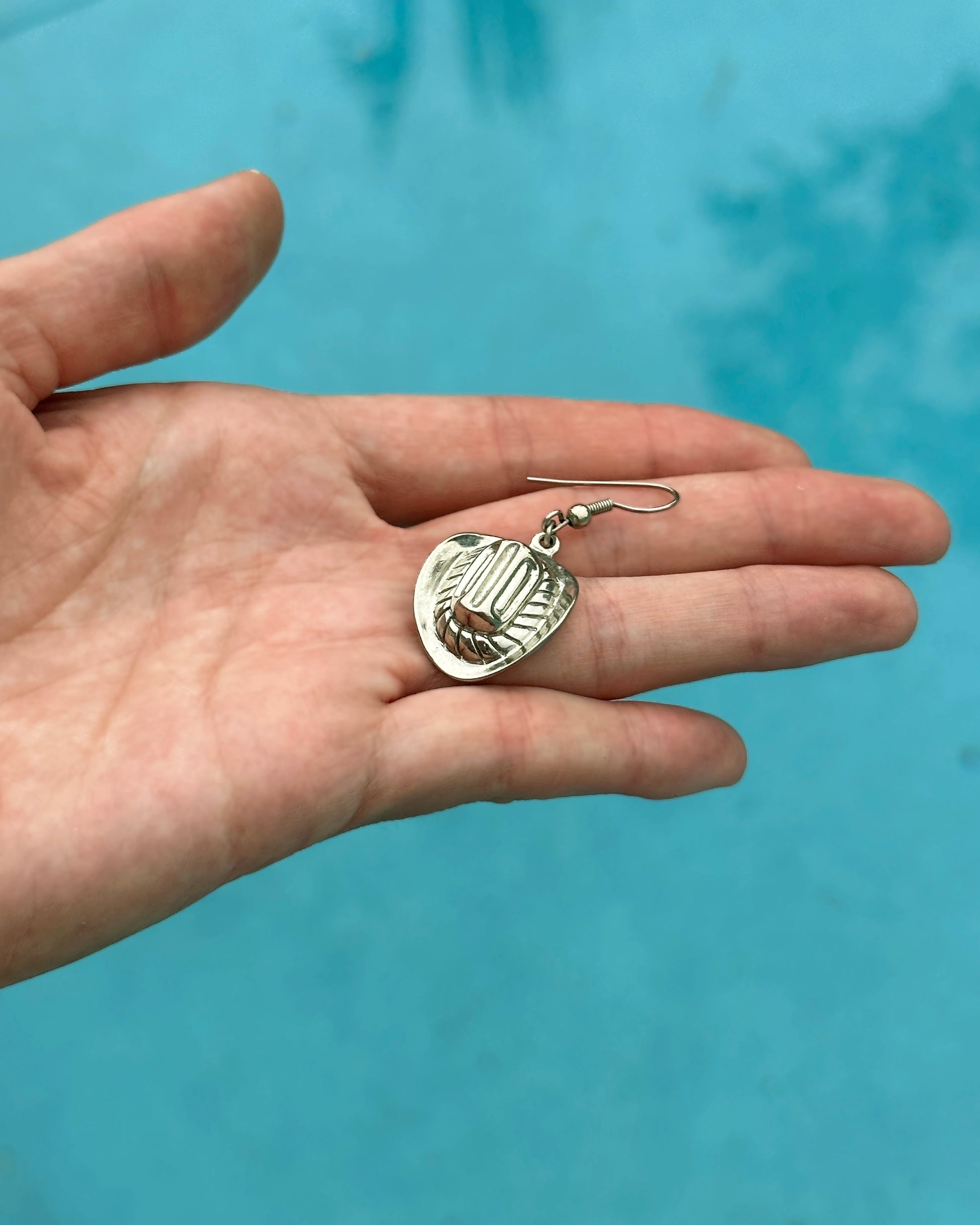 I love this whimsical sterling silver cowboy hat earring, and I love even more the idea that it's a single earring— so fun to mix with other pieces! It was made in Mexico or the Southwest United States, and features sculptural details that convey the idea of movement. It sits on a fish hook for pierced ears. The total drop is 47 mm; hat charm measures 21 mm long x 19 mm wide. Signed with the hallmark "SW" and 92 for sterling silver (or a silver purity nearly identical to sterling). Note that it is a single earring, not a pair. The Vintage Koi Fish Pendant pictured is also available.