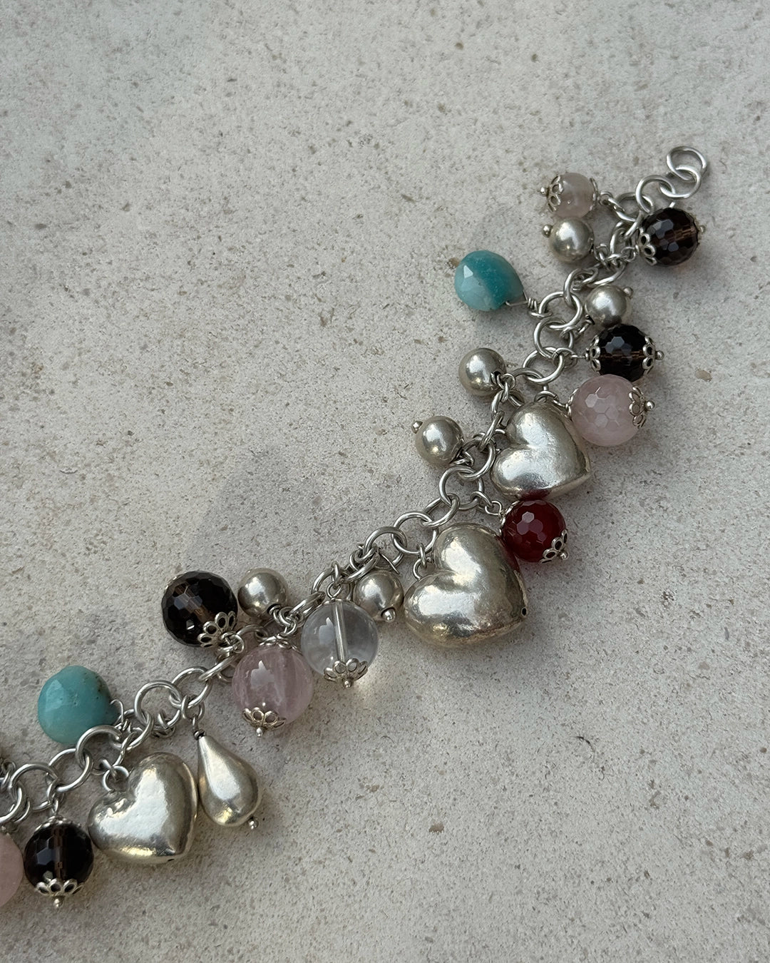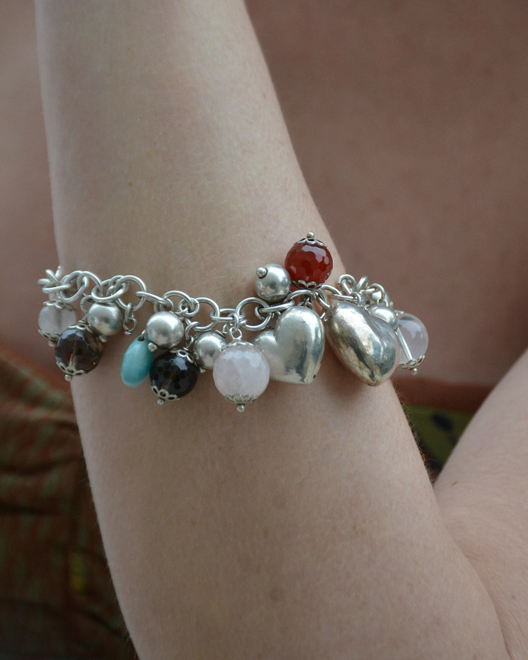 This vintage sterling silver gemstone charm bracelet was made in Italy, and is dense with charms, creating incredible movement. Gemstones are shaped into gorgeously faceted beads, including rose quartz, carnelian, blue quartz, clear crystal, and smoky topaz. Additionally, there are charms of silver orbs and puffy hearts. This makes such a sweet gift! Hallmarked "Italy" and "925" for sterling silver. Closes with an oversized lobster clasp, and measures a maximum of 8.25", but can also be worn smaller, as the clasp can attach to any link on the chain.