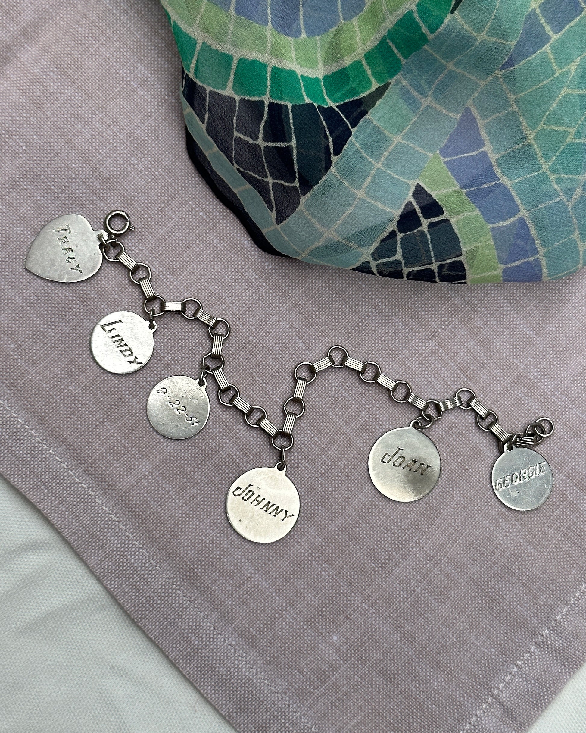 This vintage charm bracelet is so special— I love finding sentimental pieces like this and imagining who they belonged to, and all the stories behind the treasure. It is crafted of sterling silver, both the bracelets and the individual charms. It features a flattened rolo chain, with link alternating between small circles and flattened ridged oblong links, for a low profile (the perfect chain for a bracelet). Each charm features an engraved name, and on the reverse, a date (presumably a birthdate). I would venture to guess it was a grandmother's and these are her grandchildren. The inscriptions are as follows: Georgie, Joan, Johnny, Jan, Lindy, Tracy; on the reverse: 2-10-56, 7-29-42, 2-11-50, 9-22-51, 10-18-58, 6-12-69. If any of these dates holds significance for you, it's an especially fun find! It has two clasps to adjust the length: 7.25" or 7.5" with a weight of 18 grams. Different charms were added at different times and have various hallmarks/maker's marks denoting it is sterling silver. The Vintage Italian Sterling Silver Heart Bracelet pictured is also available.