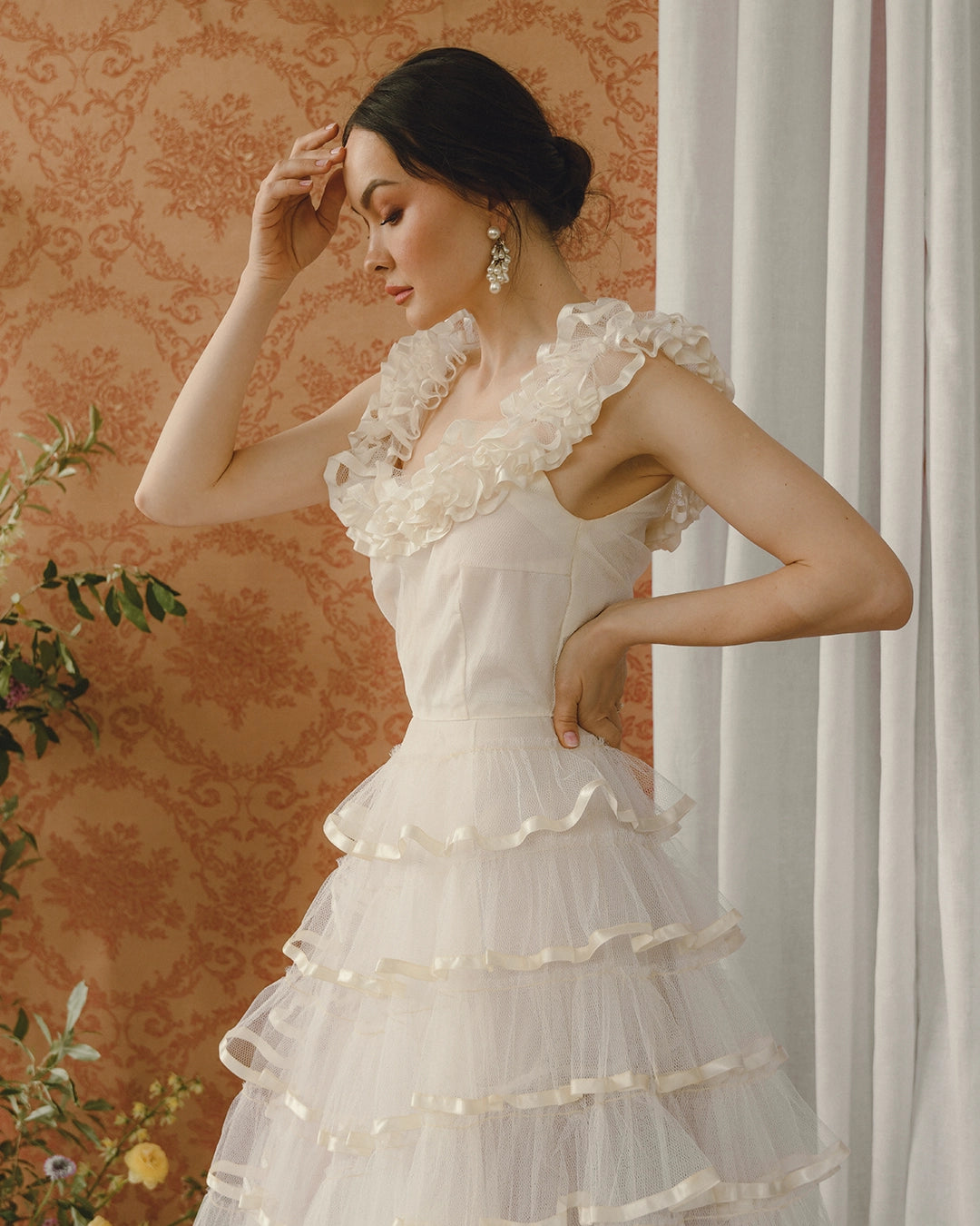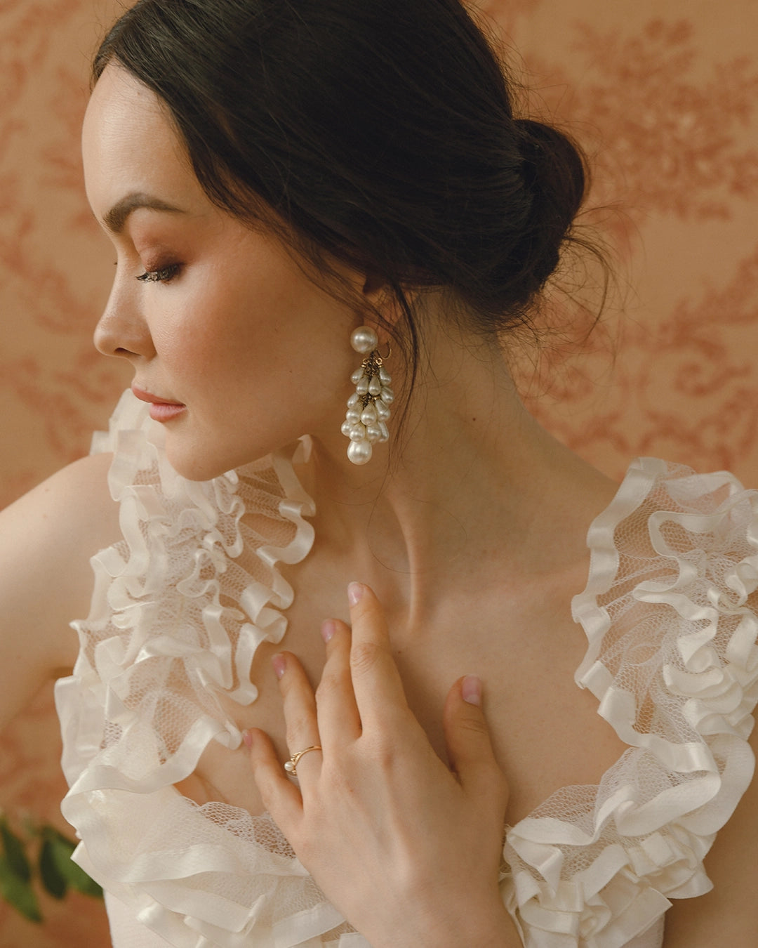 The Vintage 1950s Ruffled Tulle Cupcake Gown and Vintage 14k Gold and Pearl Ring pictured are also available.