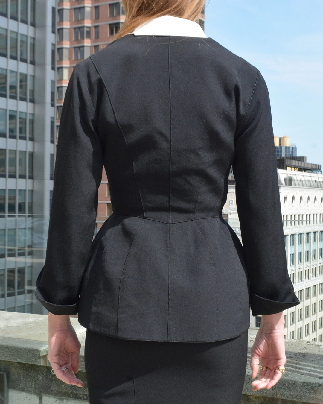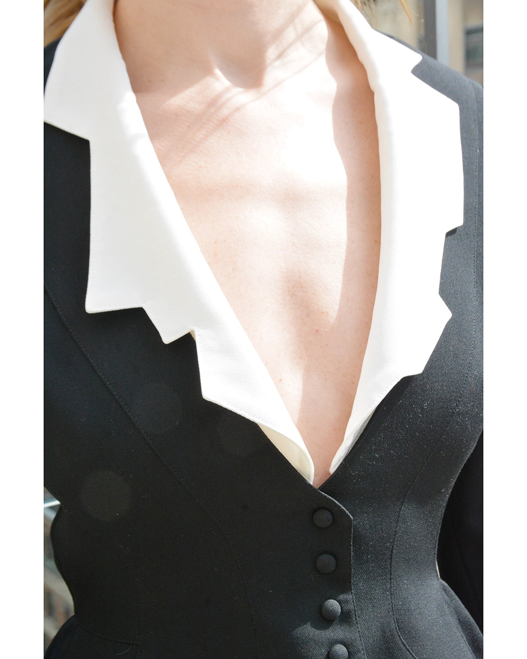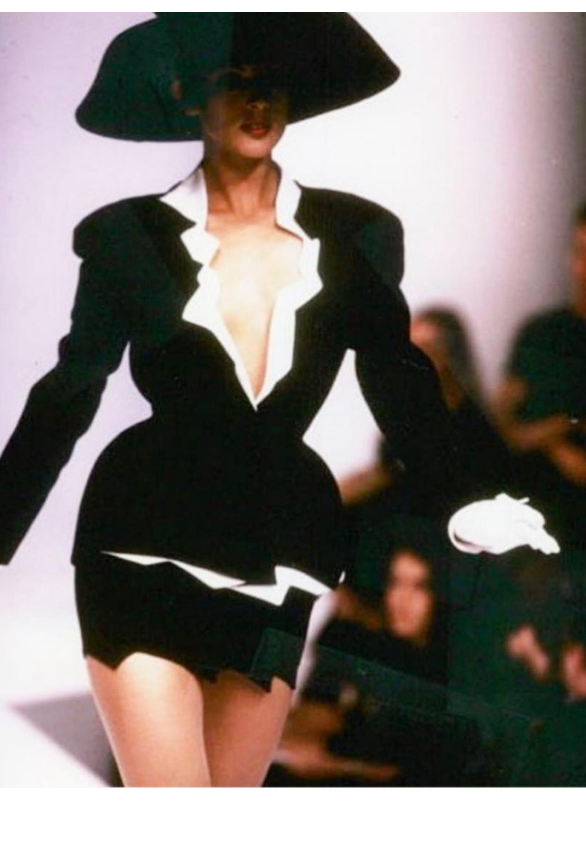 This vintage Thierry Mugler jacket is from his Spring 1994 collection entitled "Longchamps." Pieces from the collection are universally considered museum-worthy, with some pieces from the collection residing in the Metropolitan Museum of Art. This collection was defined by pieces with unusual jagged edges, like puzzle pieces or cut glass, and this jacket embodies that idea, with the contrasting white lapel that is asymmetrically cut to look like a piece of sculpture. The most amazing part of this piece is that the collar attaches with hidden snaps, and is completely removable, providing two entirely distinct looks inn one piece— the ultimate investment! The silhouette forms a flattering hourglass shape, nipped at the waist, and opening in an exaggerated bell over the hips almost like a peplum. The lines and construction are just unbelievable, and it looks so amazing on the body! Crafted of 100% wool, closes with 4 snaps at the waist. (Please note there is not a skirt or bottoms included.)