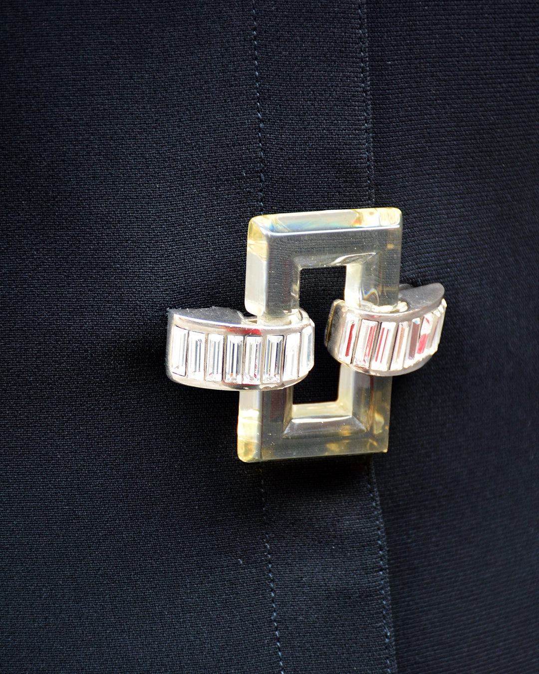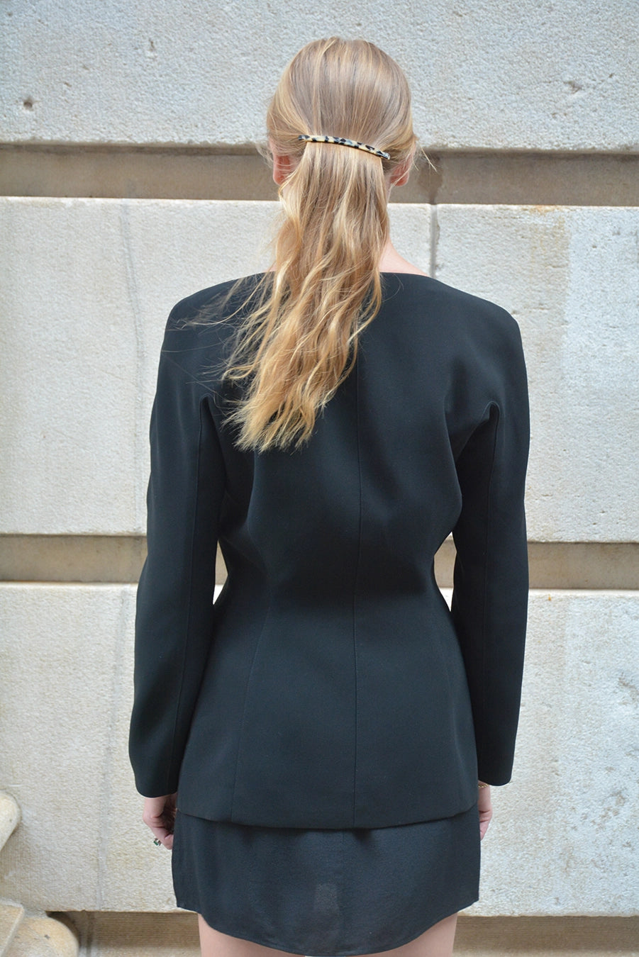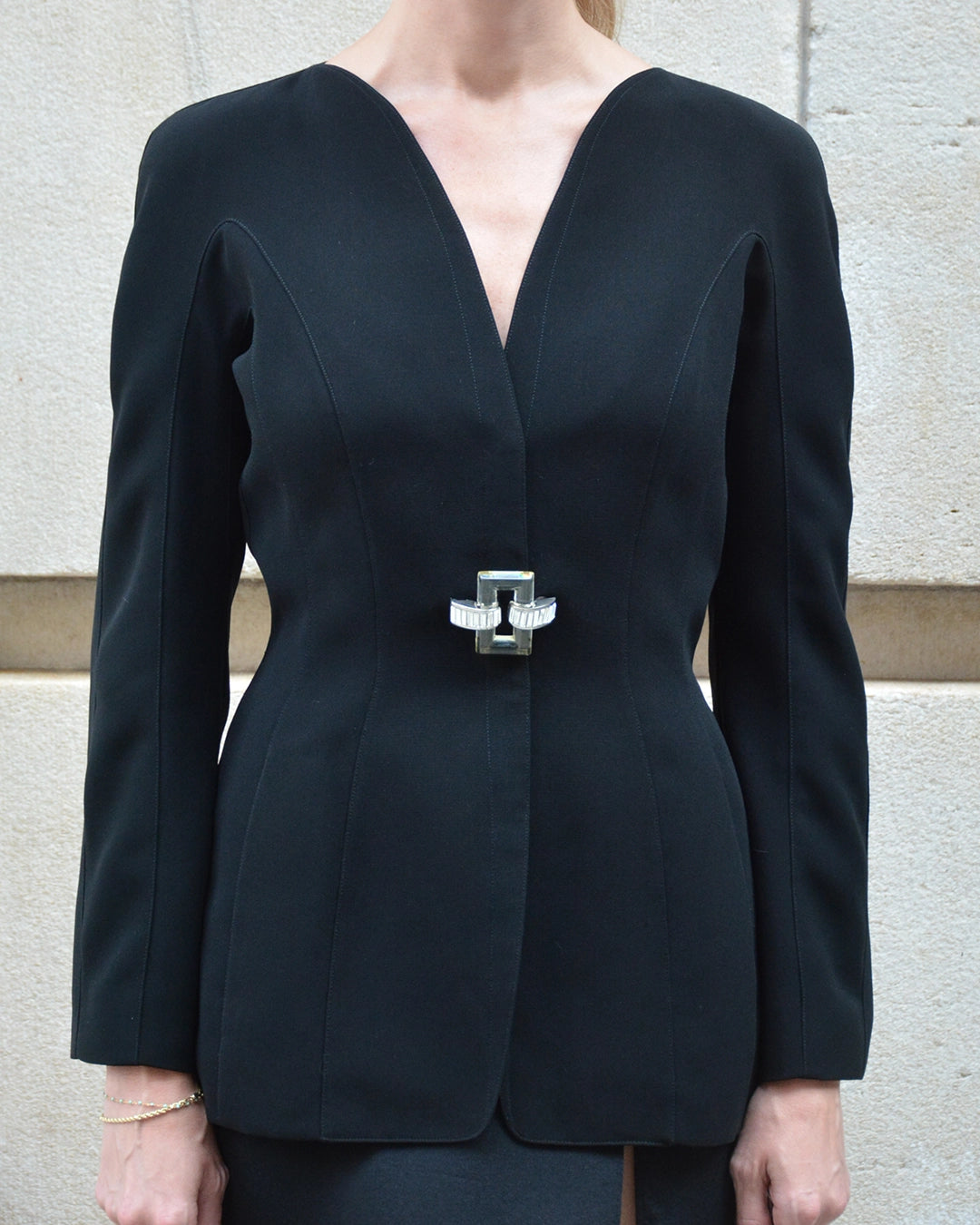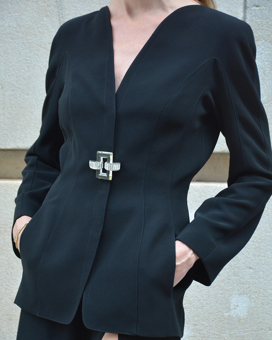 This Vintage Thierry Mugler Spring 2000 jacket has the most exquisite lucite buckle detail, which is a work of art in and of itself— a classic example of Mugler's work. This collection had a very futuristic vibe which is echoed in this piece. Shaping seams throughout create a really sleek, elongated silhouette, with sloped shoulders. A nipped waist is a Thierry Mugler signature and this jacket is no exception. The lucite detail is set with crystals, whose sparkle play off the lucite's shine. Hidden snap closures live under the ornament. There are pockets built into the seams— it is so beautifully constructed! I love this piece because there are so many ways to style it, whether you wear it with a simple black skirt like a suit, or mix it up with more contrasting statement pieces, including pants or jeans. On the runway it was actually shown with a more gauzy chiffon skirt which I love! The fabric/care label is worn but it is wool or wool blend.