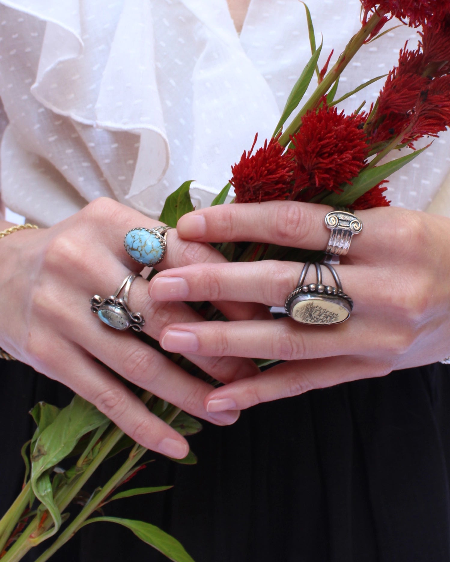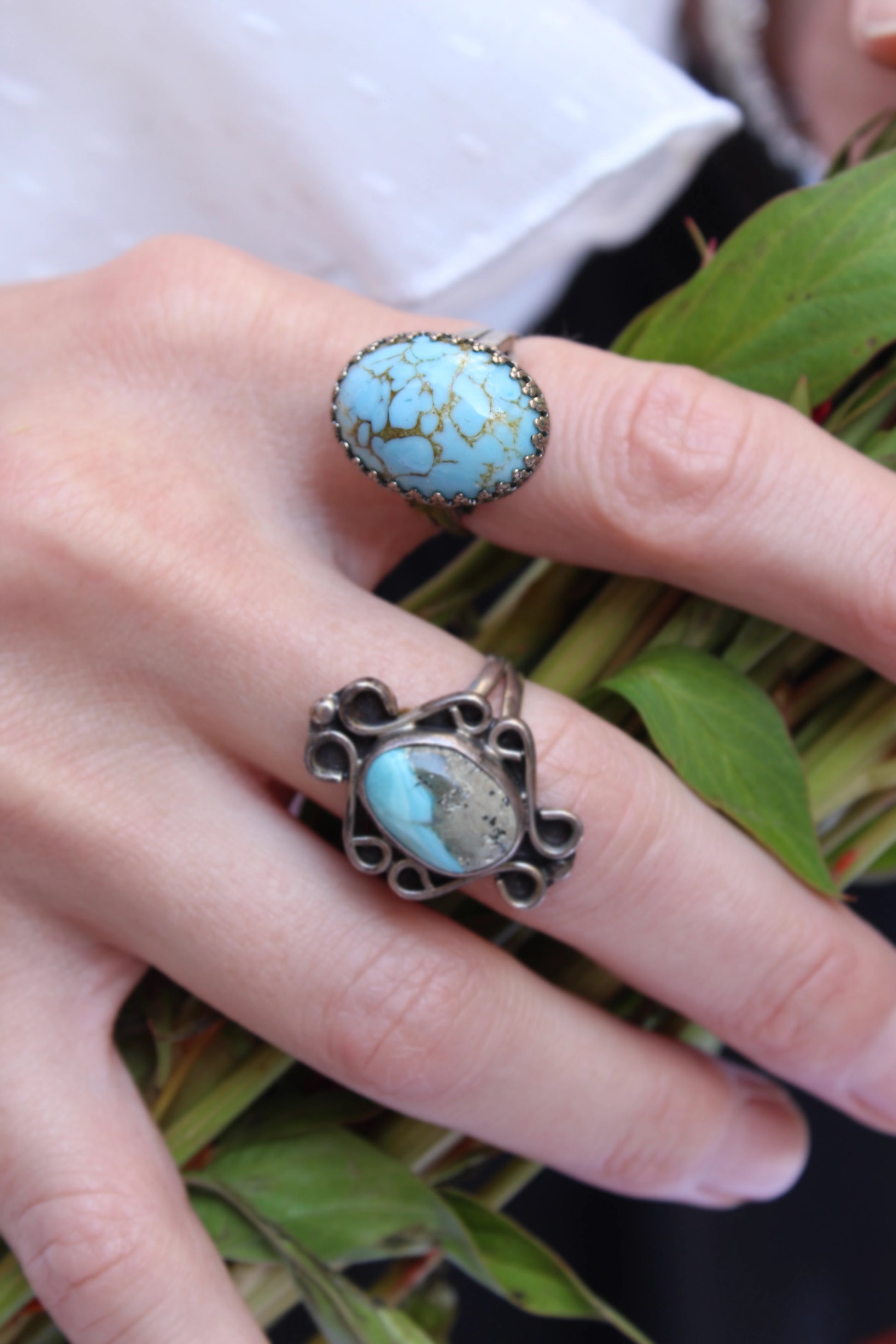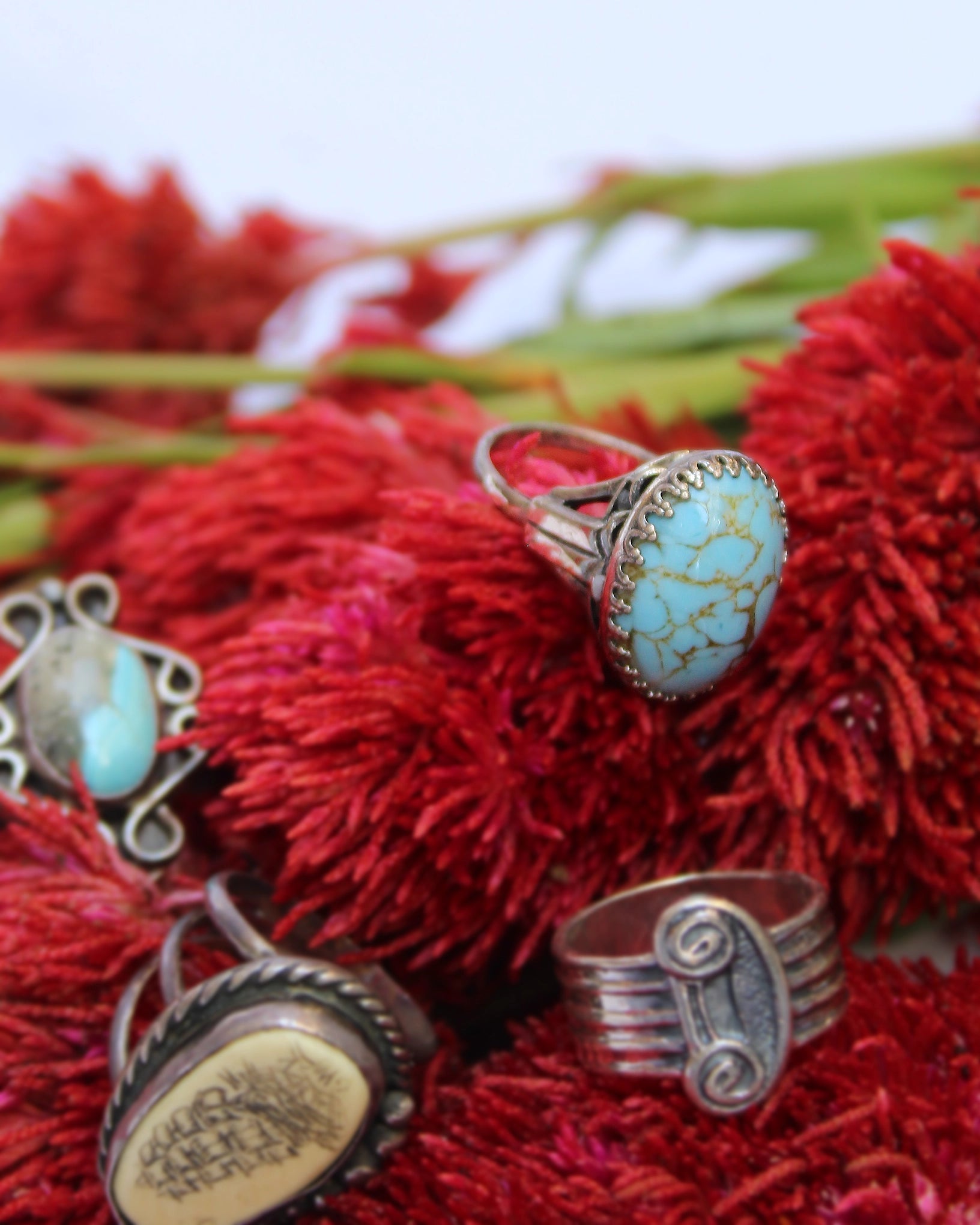 This stunning turquoise cocktail ring features an ornate sterling silver setting, with a high cathedral emphasizing the beauty of the cabochon stone. The band size of this ring is adjustable, and the mechanism by which is adjusts is very sophisticated and well made, with the excess band hidden in the ring's cathedral. The ring is one-of-a kind artist made and is not signed or hallmarked, but has been tested for sterling silver. The Vintage Artisanal Turquoise Ring, Vintage Italian Sterling Silver Braided Bracelet, Vintage Chunky Braided Bracelet, and other vintage rings pictured are also available.