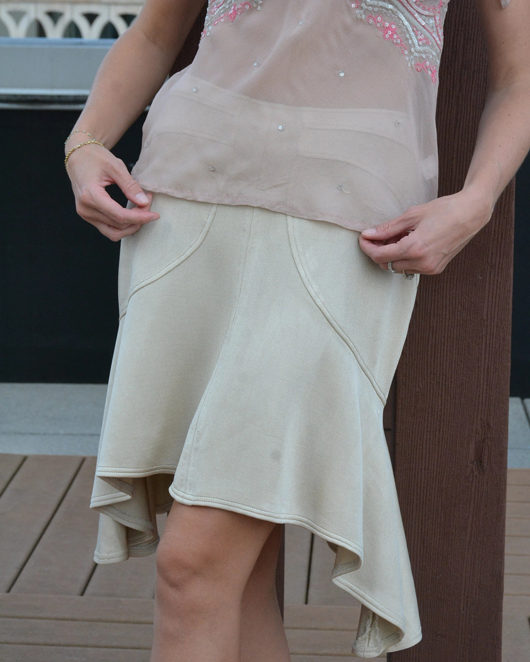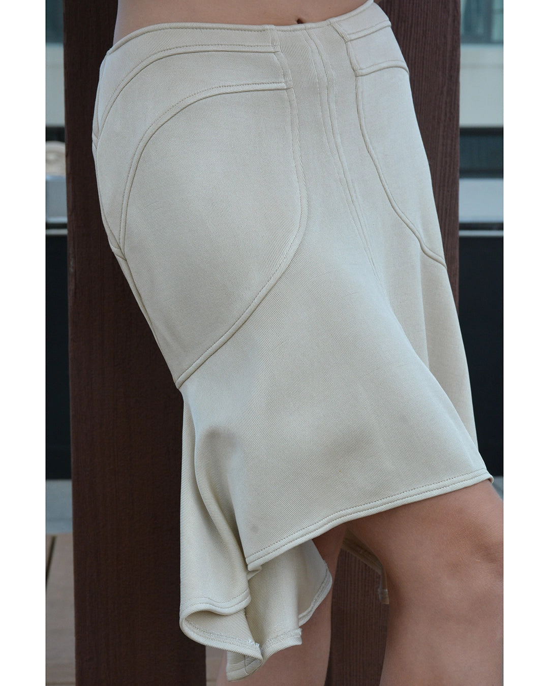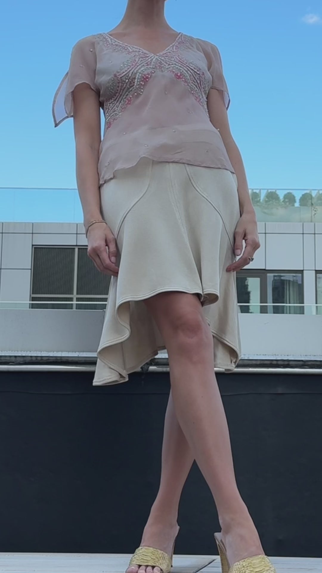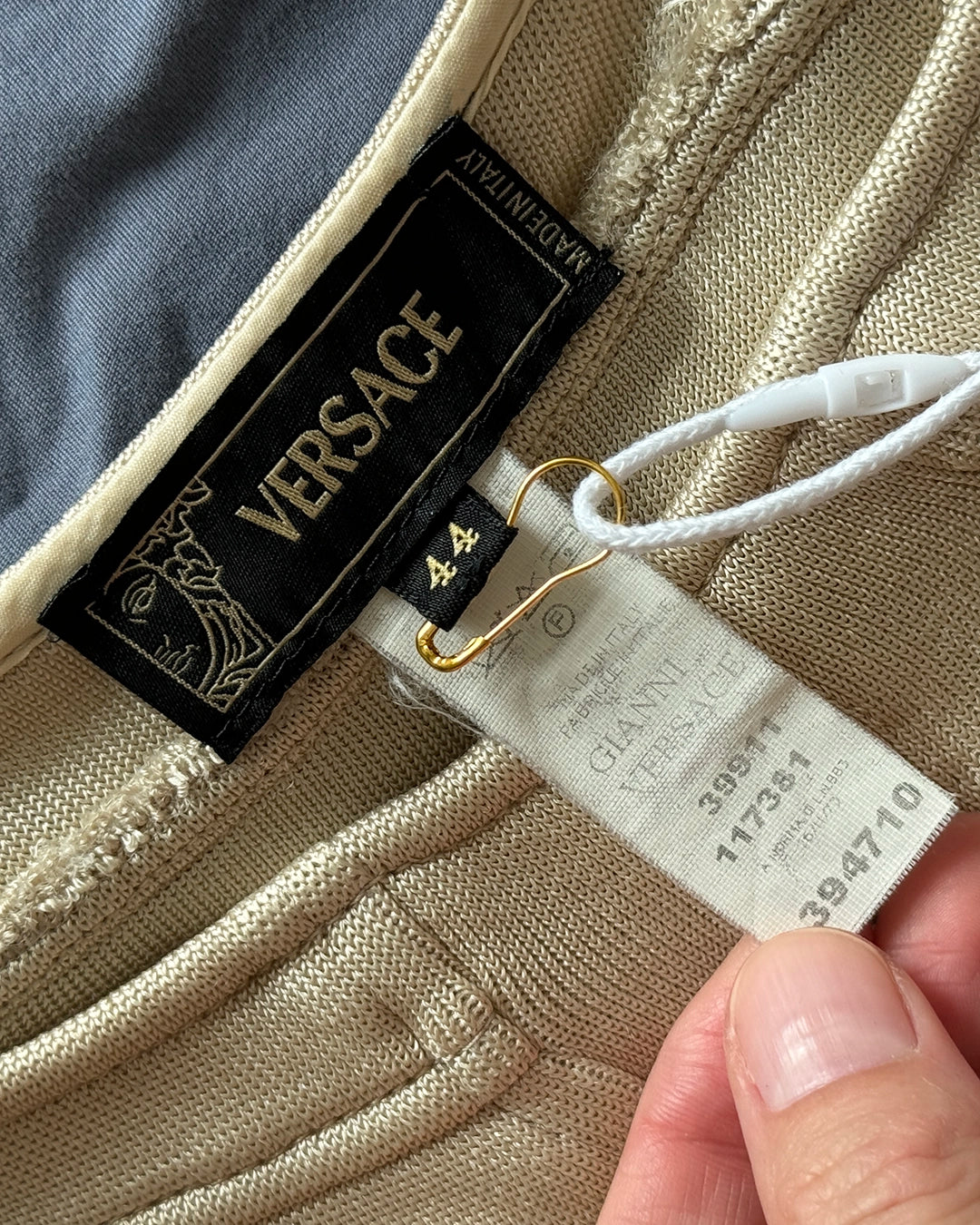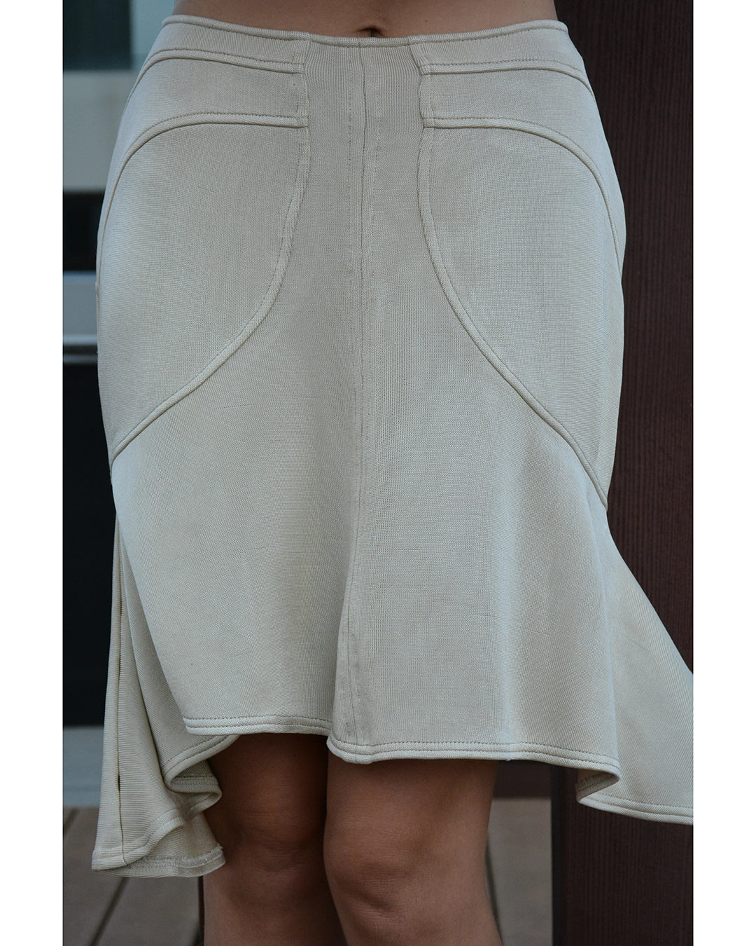 This vintage Versace Fall 2005 bandage trumpet skirt is Y2K Versace at its finest— and Donatella Versace in all her glory. It was made in Italy, and is so well-crafted, made of a really luxe stretch jersey for a "bandage" effect. There are trompe l'oeil details throughout, giving the effect of seams and pockets. It's fitted through the hips and then flares into an asymmetrical trumpet shape, which accentuates the hourglass shape of the hips in a really sexy way. I love that this piece is completely seasonless, in a neutral color: you could easily style for summer weather with a little top, or layer and wear with boots as shown on the runway.