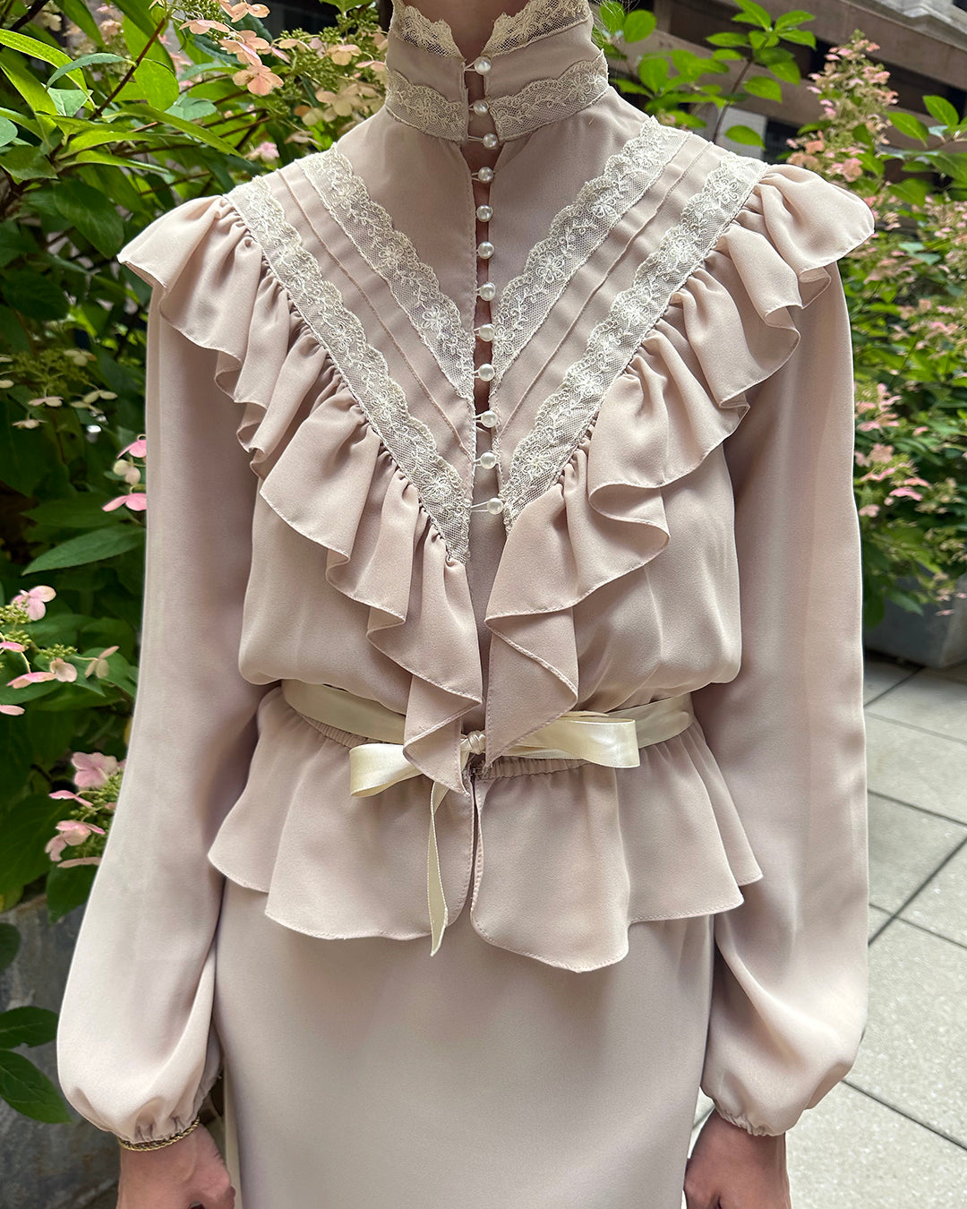 This is such an amazing piece, and I love that it's actually three distinct looks in one: The top is separate from the underslip, and you can actually wear it with either side as the "front." I also love the top worn on its own with jeans. It's a classic example of 1970s fashion revisiting the Victorian era. The lace, the ruffles, the little pearl buttons— I love it all! It's finished with a ribbon tie at the waist, and a little peplum flounce. The slip portion as a slight V neckline, with a slit on one side for ease of movement. The Vintage Peggy Daven Slides pictured are also available.