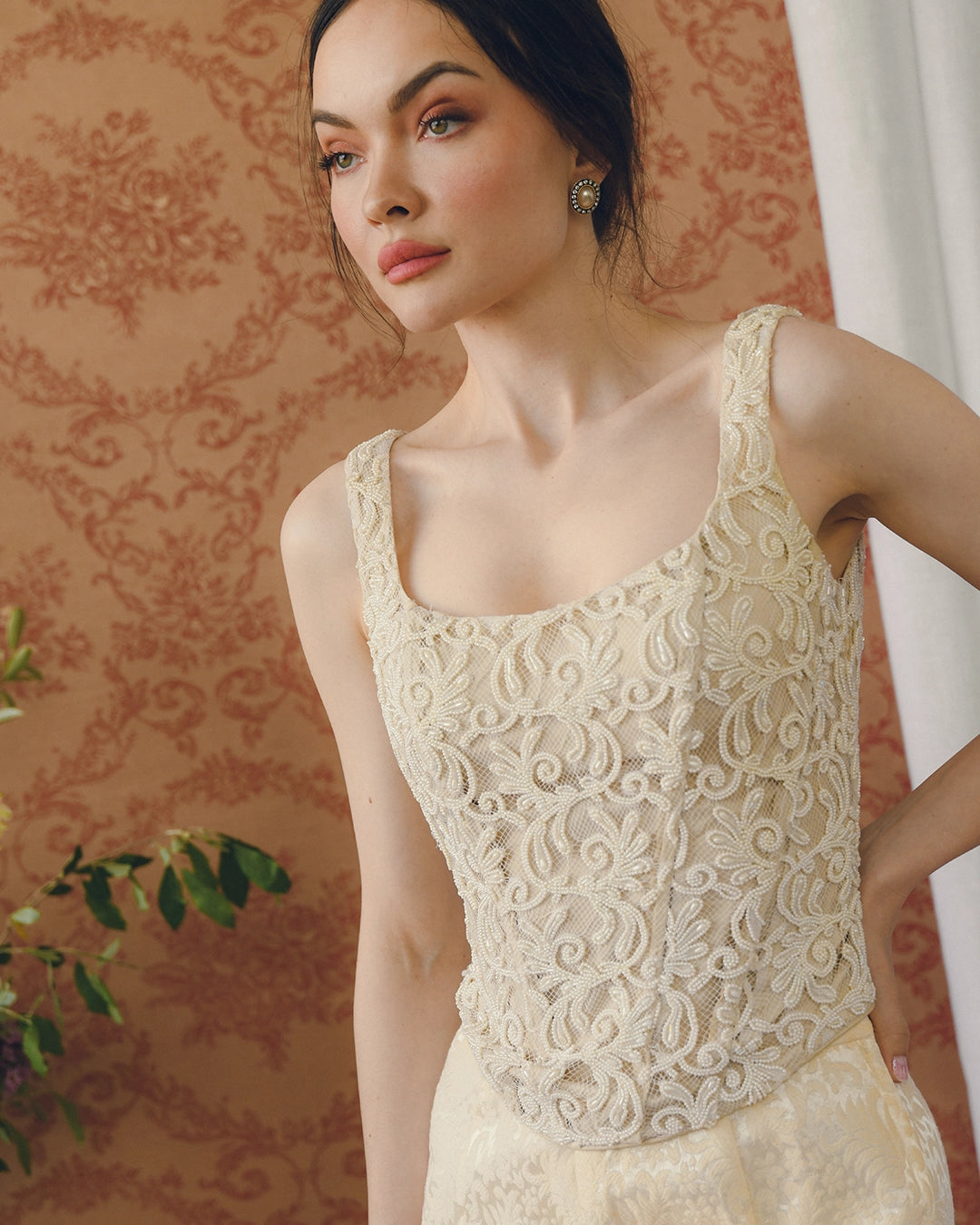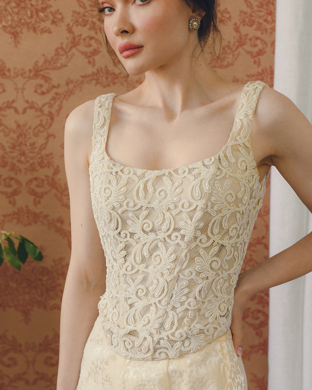 The Designer Vintage Beaded Corset Top pictured is also available.