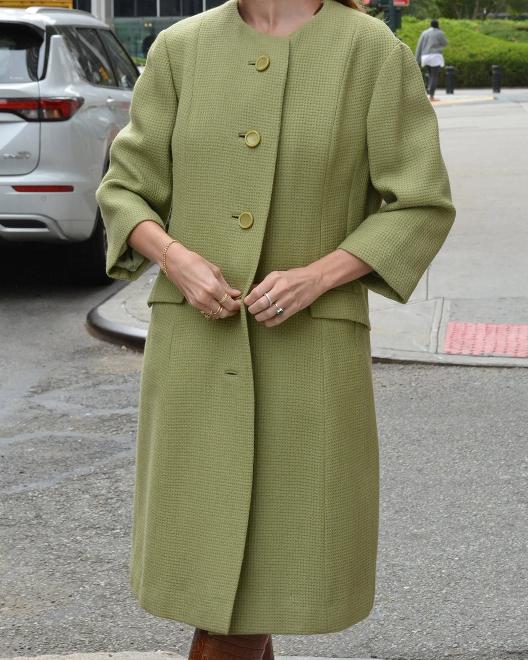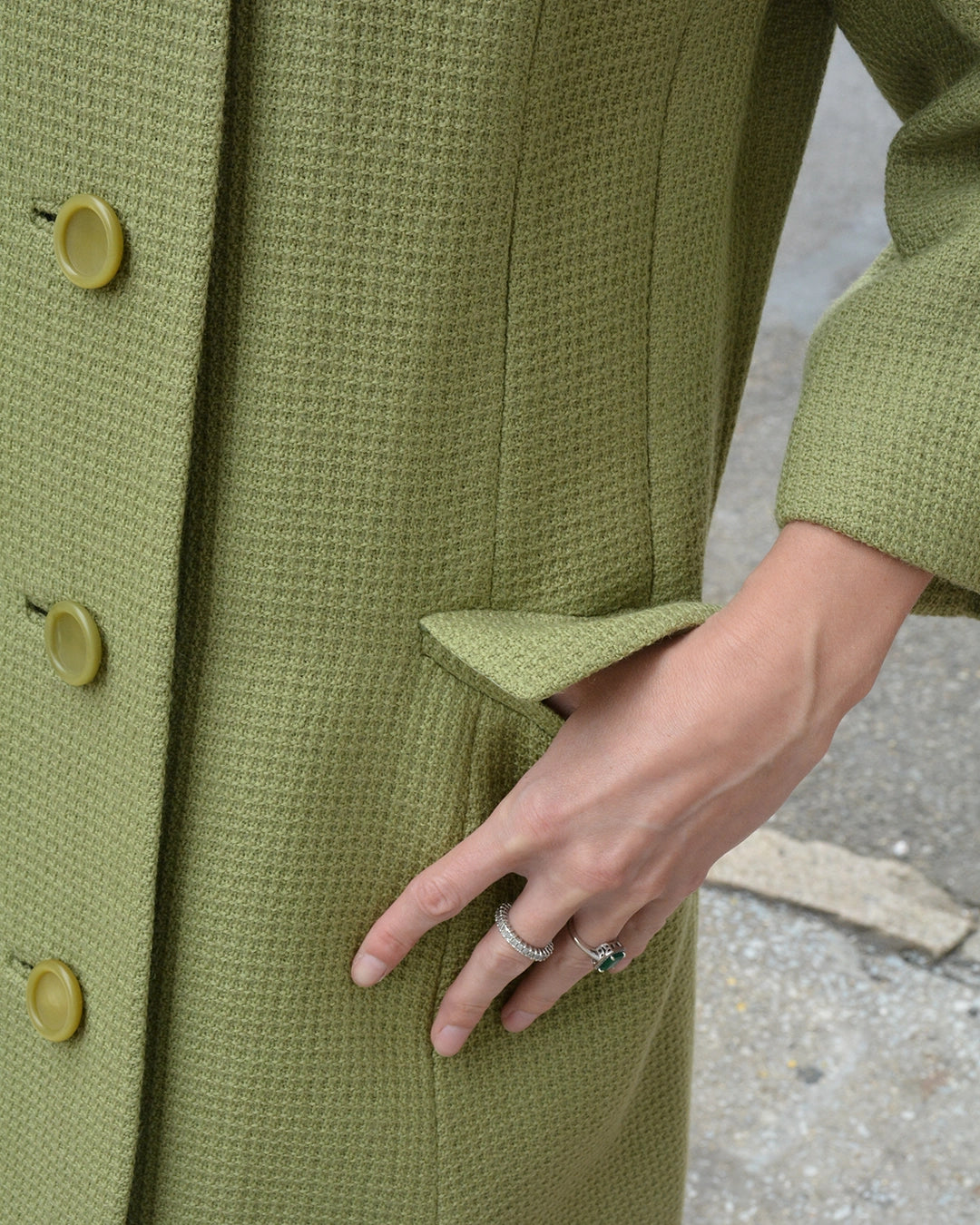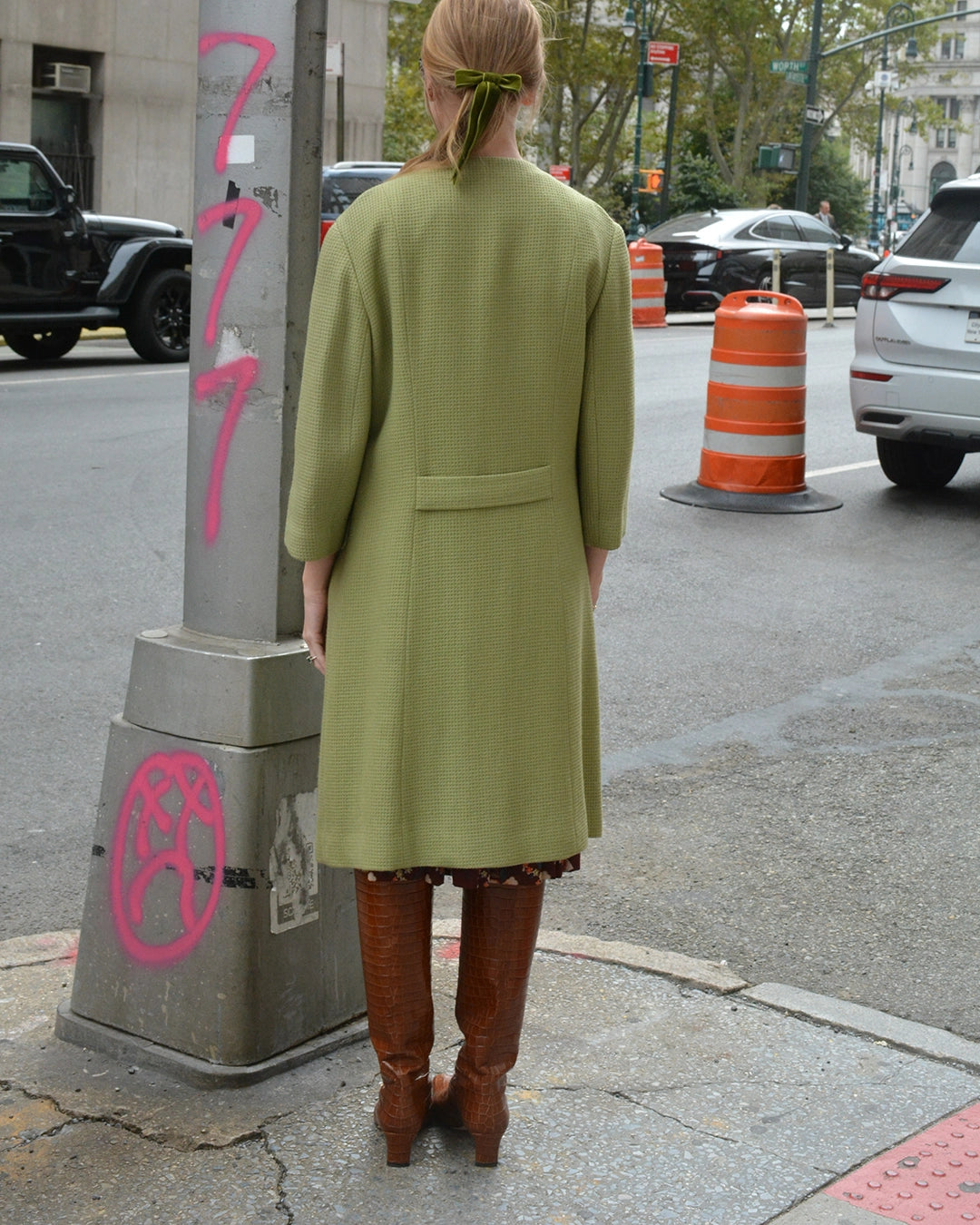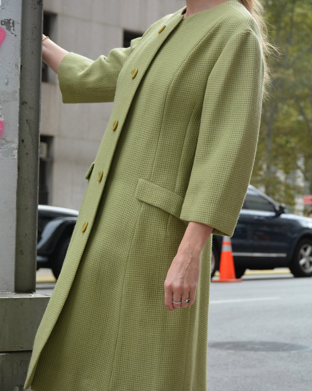 This vintage wool coat is crafted of the most beautiful pistachio-hued waffle-texture wool— I love a bright coat because it adds interest to an otherwise toned-down look (and a dreary day). I believe it was made in Italy, and the style is very 1960s, with the A-line shape. It has shaping seams down the front, somewhat cropped sleeves, and a martingale belt in the back. The flap pockets in the front are functional! Fully lined; Fiber contents are not listed but feels like 100% wool.