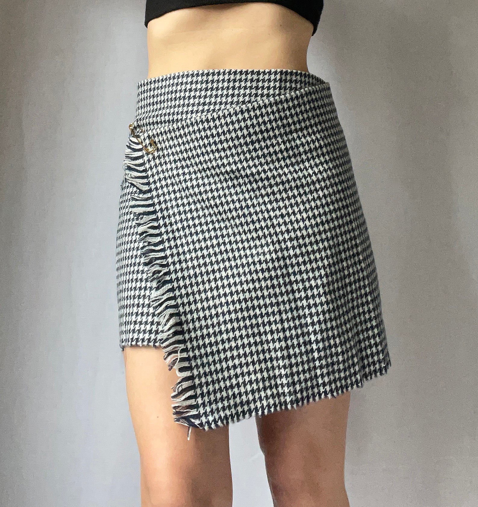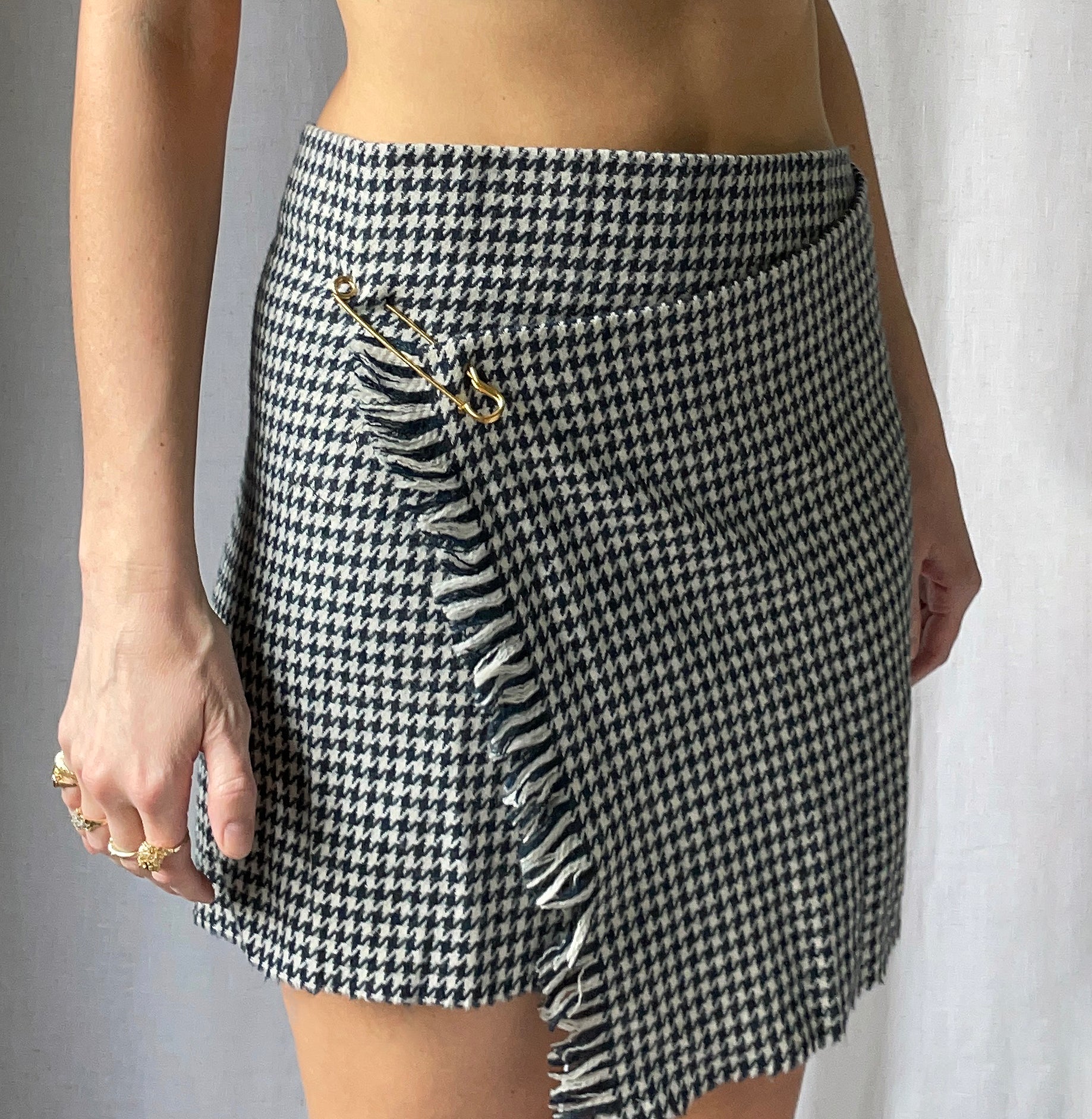 This vintage houndstooth wool wrap skirt is totally unique— it's giving a sort of Alexander McQueen English punk vibe. It is actually a rectangular piece of wool, which is secured by a safety pin, so the fit is completely adjustable, and there are so many other creative ways to wear it— it could even be worn as more of a scarf/wrap around the shoulders as well. Since the safety pin closure is completely adjustable, this will fit a range of sizes (see below).