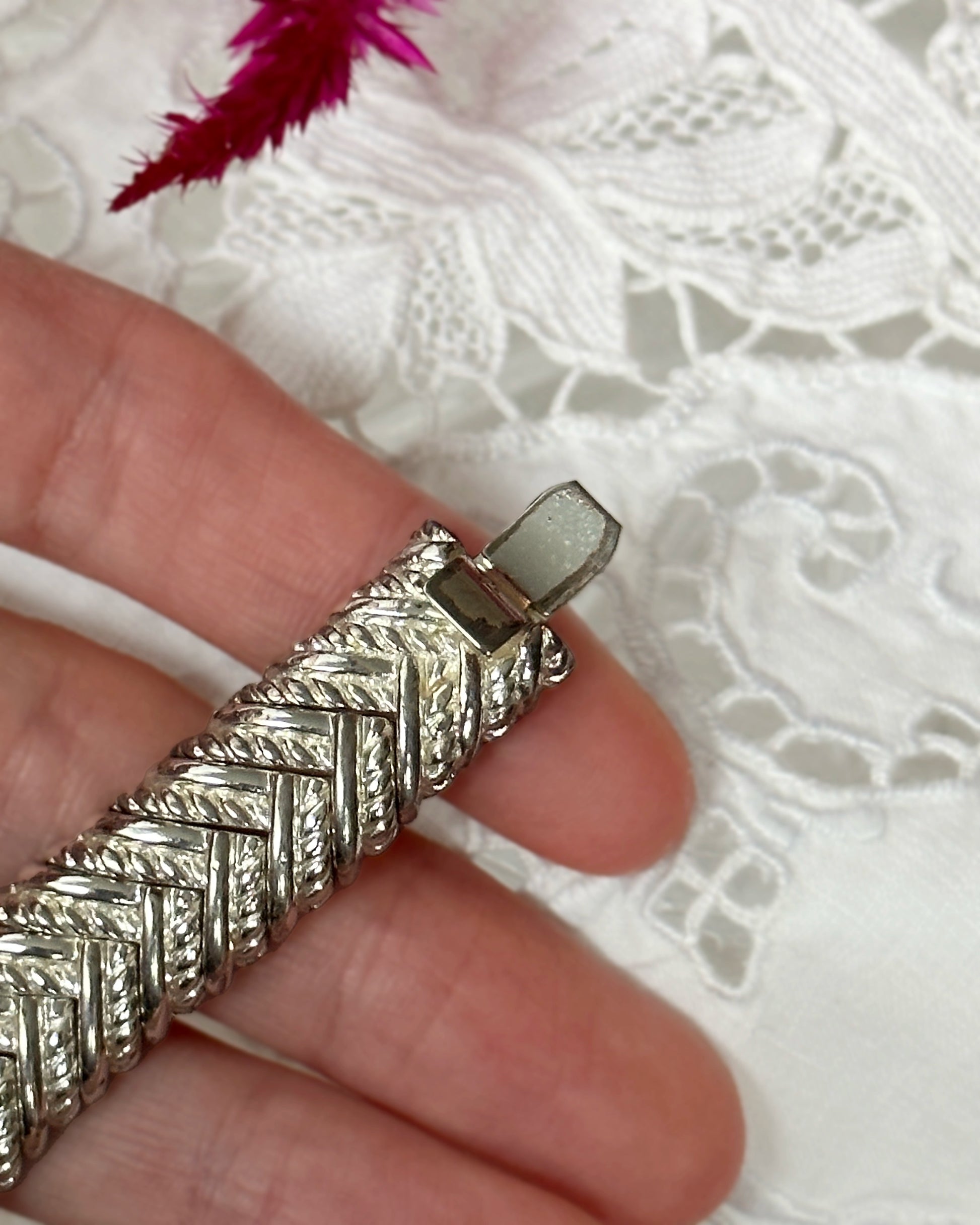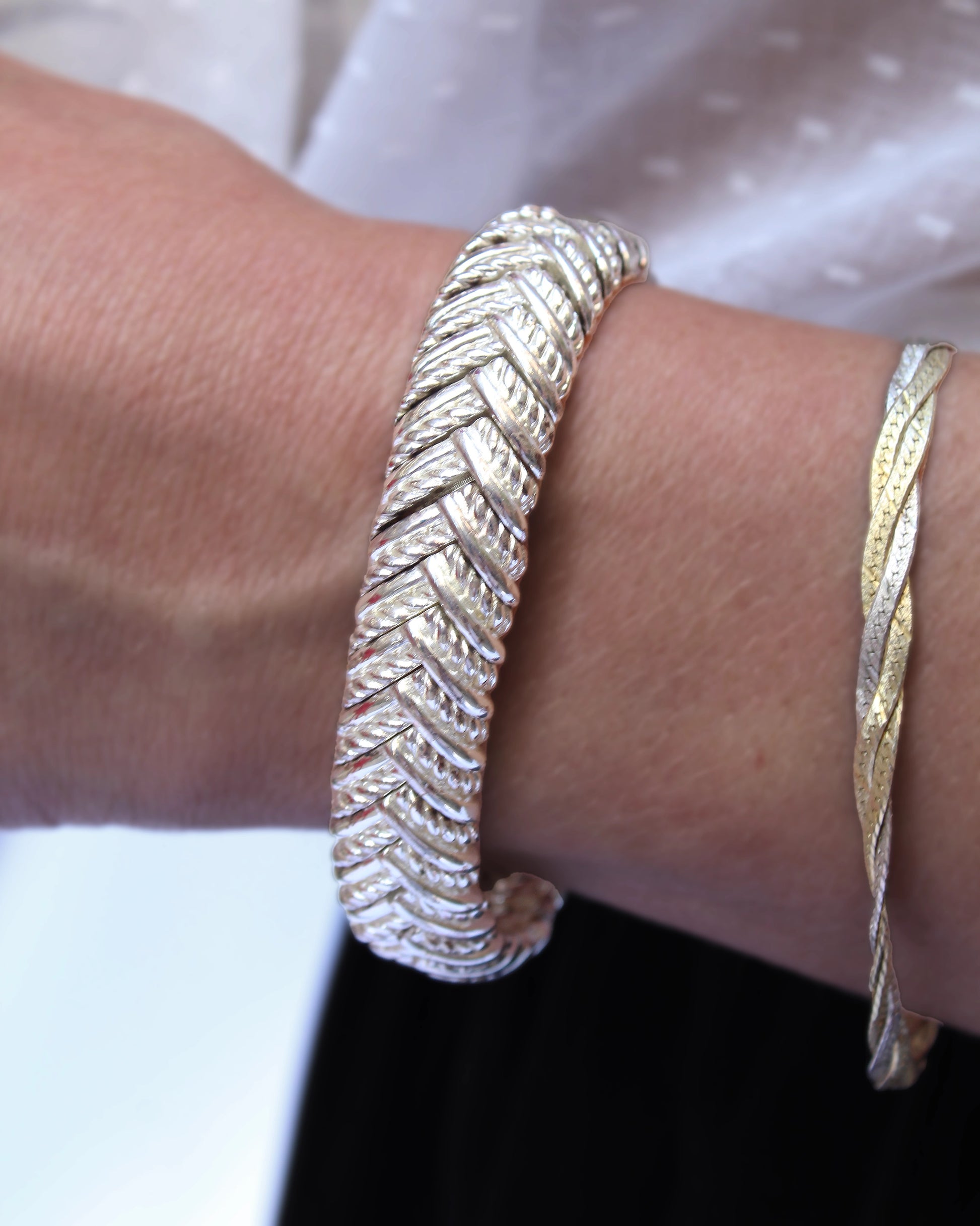 I love the dimension and texture of this vintage chunky braided bracelet. Although it looks like one solid mass, each piece is individually strung to fit together, which means the piece has a lot of movement and flexibility (not rigid). Not signed or hallmarked. Measures 6.5" long x .5" wide, closes with a box clasp. The Vintage Italian Gold and Sterling Silver Braided Bracelet and Vintage Turquoise Cocktail Ring pictured are also available.
