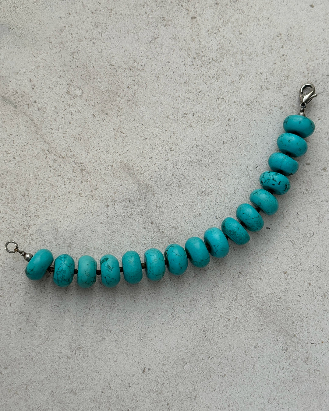 This vintage turquoise bead bracelet adds a carefree, effortless vibe to your wrist stack. It's strung with turquoise, polished into chunky rondelle beads, which have a really matte effect. I love this piece mixed with more sparkly pieces, like polished metals, diamonds, or other gemstones. It measures about 7.75" long and closes with a lobster clasp.